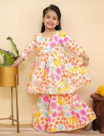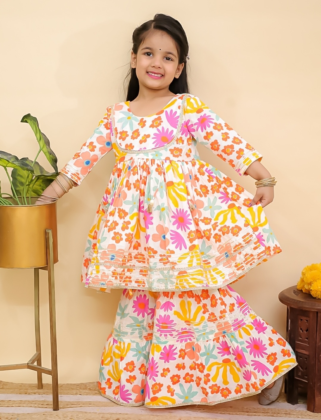 a flared kurta with vibrant floral prints in shades of orange, pink, yellow, and blue, paired with matching wide-legged sharara pants for a stylish and comfortable look. Designed with full sleeves, delicate tassel details, and a flowy silhouette, this outfit beautifully blends tradition with modern charm