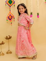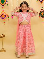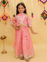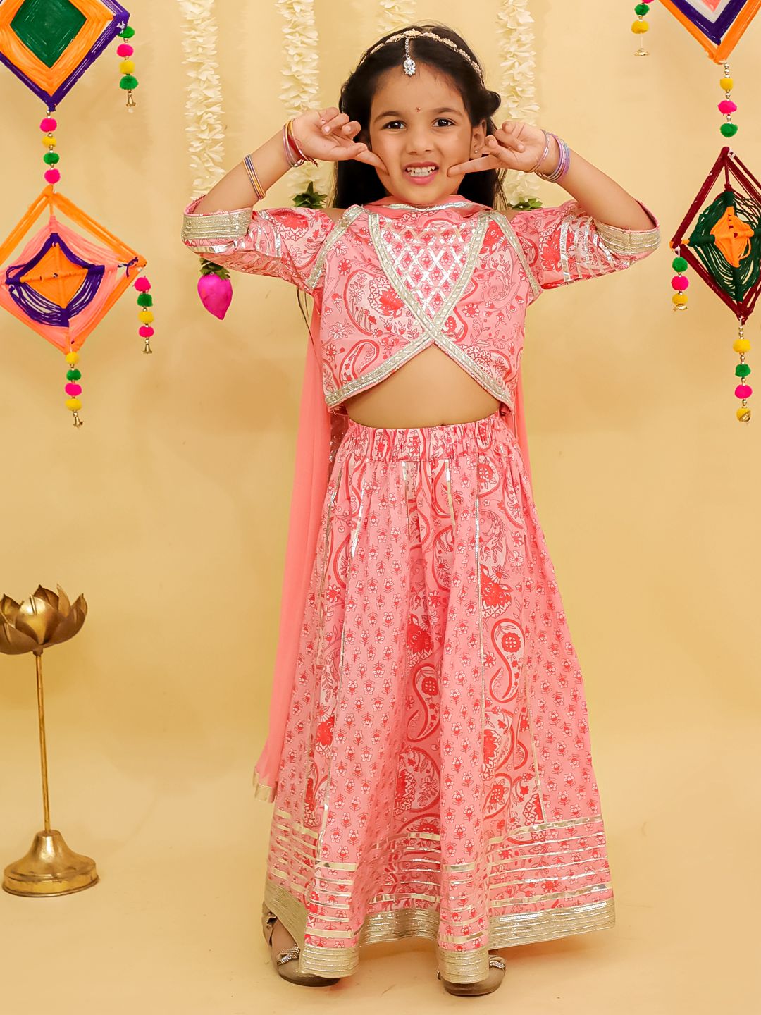 A charming traditional lehenga choli set for girls, designed in a beautiful shades with golden accents. The outfit features a stylish cold-shoulder blouse with intricate work and zari border, paired with a flowy lehenga adorned with paisley and floral motifs. The hemline is highlighted with golden striped detailing, adding elegance to the look. A matching chiffon dupatta drapes gracefully around the neck, completing the ethnic ensemble.